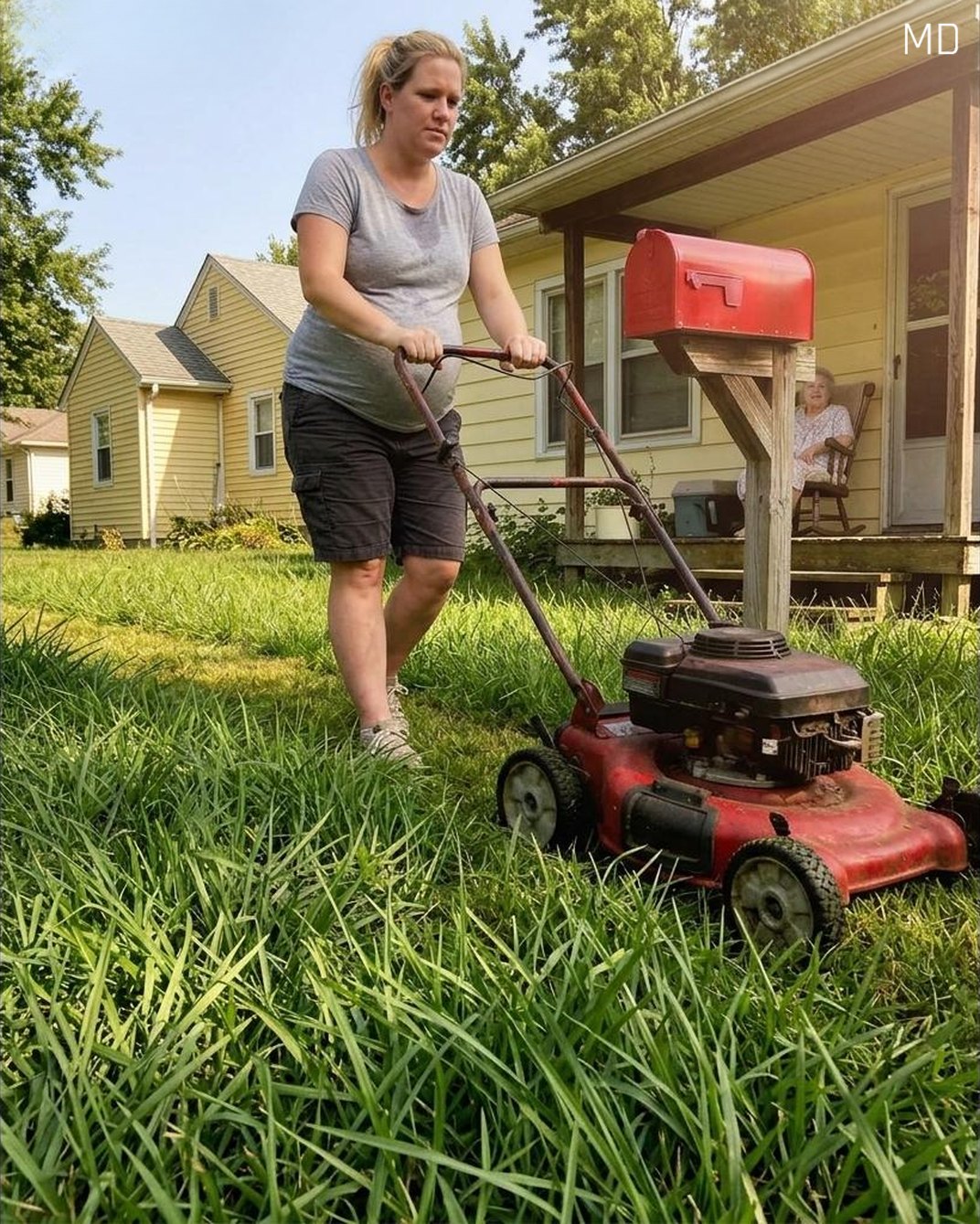 At thirty-four weeks pregnant, I believed my life had reached its breaking point. My partner had left when I chose to keep our baby, and now the bank was warning that my home was headed toward foreclosure. Bills covered my kitchen table, my savings were nearly gone, and every day felt heavier than the one before. That afternoon, desperate for air after the call from the bank, I stepped outside and saw my elderly neighbor, Mrs. Higgins, struggling to push a lawn mower across her yard beneath the hot summer sun. She was eighty-two, stubborn as ever, and clearly overexerting herself. I should have gone back inside to rest—my feet were swollen, my back ached, and I could barely keep my balance—but I couldn’t ignore her. So I took the mower from her hands and finished cutting every inch of her lawn while she sat on the porch and watched with grateful eyes.